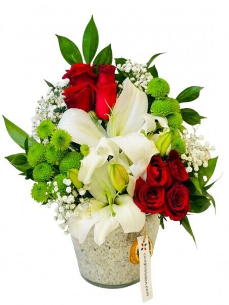 Vazoda Lilyum ve 3 Kırmızı Gül