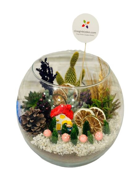 Büyük cam fanus içerisinde kaktüsler, sukulentler ve aksesuarlar ile süslenmiş bir teraryumdur.